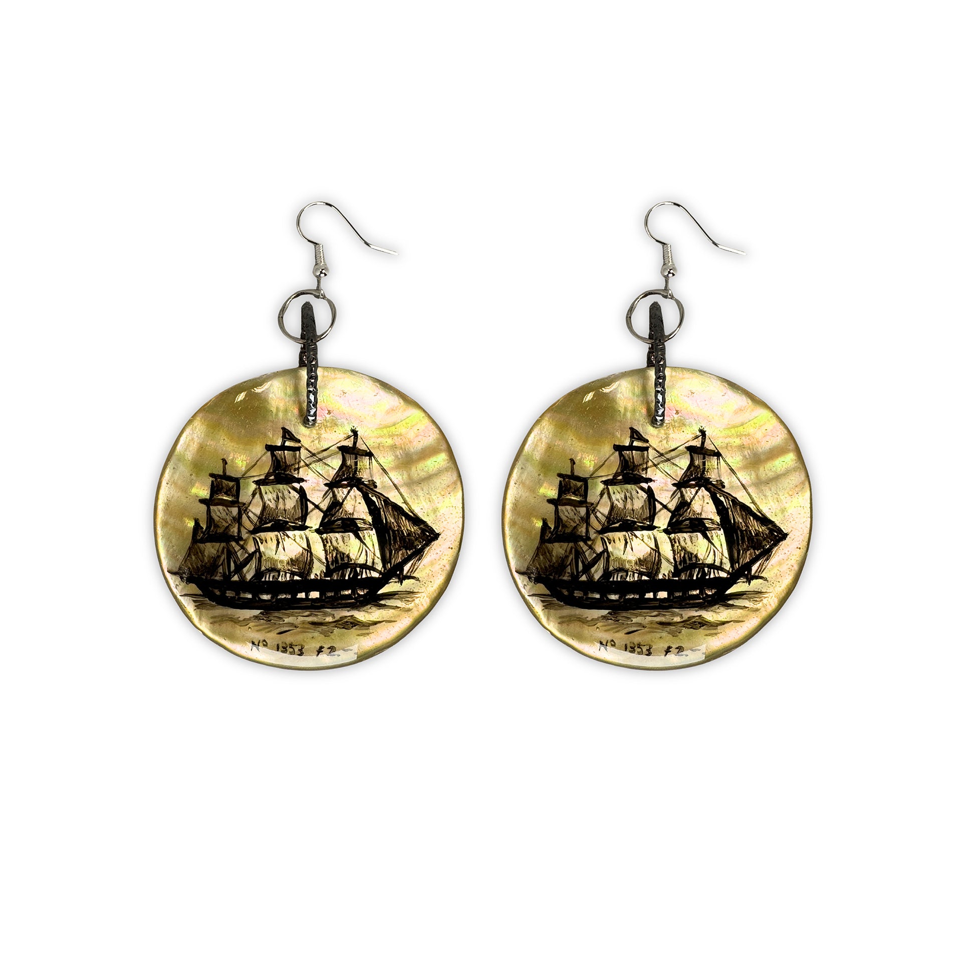 Hand-painted mother-of-pearl earrings depicting a vintage vessel guided by the Siren’s call. A luminous artefact from the Calling of the Sirens collection.