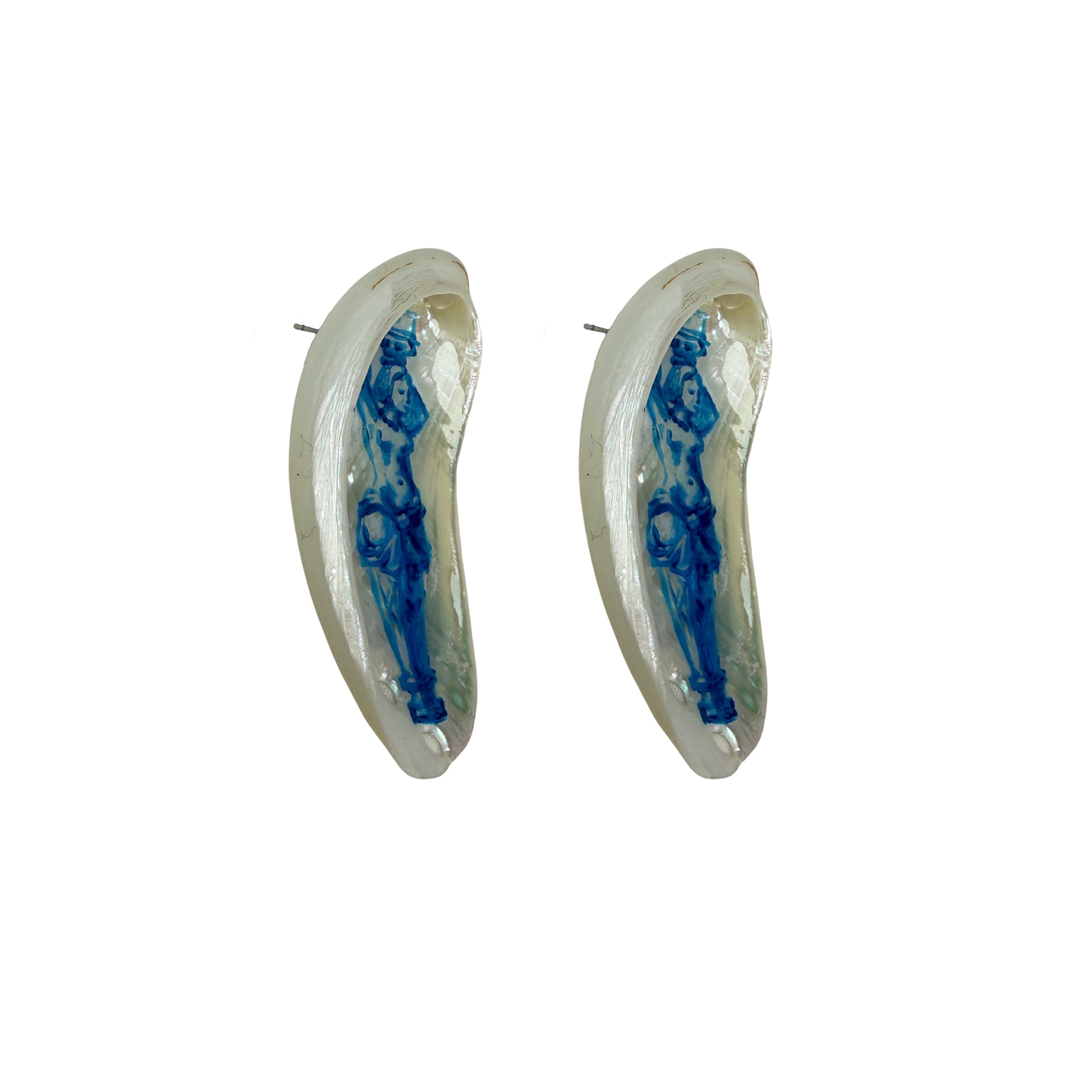 Hand painted on luminous abalone shell, Siren’s Gaze captures the quiet allure of the mythic figure who watches over the tides. Each earring features a delicately illustrated siren in deep ocean blue, her form shimmering as the light moves across the natural nacre beneath her.