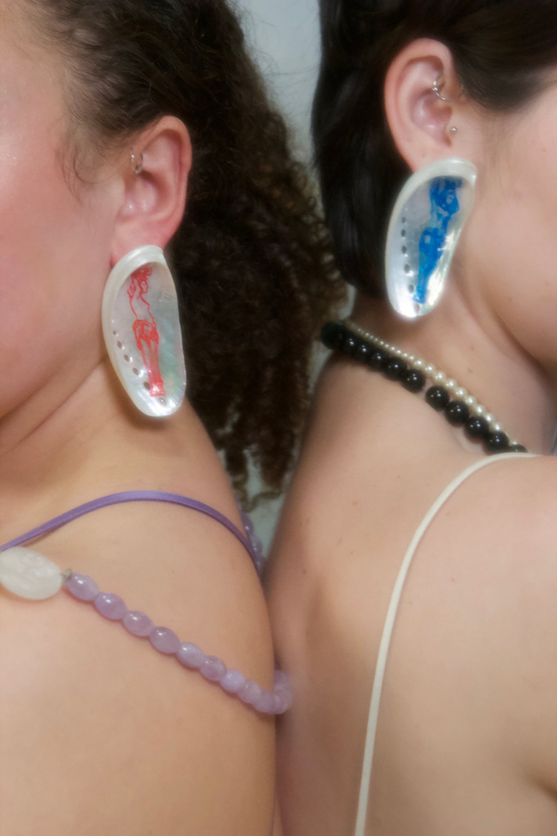 Hand painted on luminous abalone shell, Siren’s Gaze captures the quiet allure of the mythic figure who watches over the tides. Each earring features a delicately illustrated siren in vivid red, her form shimmering as the light moves across the natural nacre beneath her.